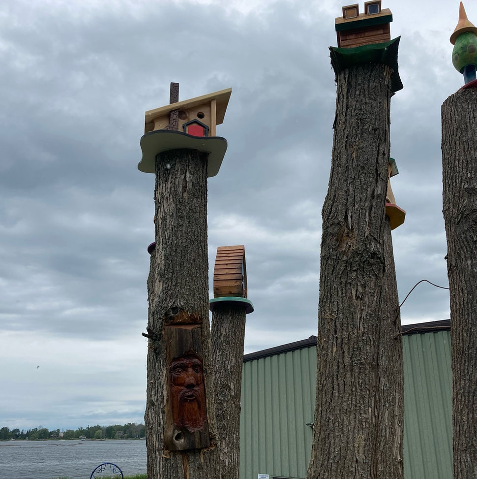 Our community minded president, Victoria Reaume, has a passion for art and making things look beautiful. She noticed other communities were displaying art projects and thought why not Waubaushene? We all agreed this was a fantastic idea so in 2023, Talpines approached Tay Township about our idea to turn the dead ash between Pine St and Albin St into living art! They agreed to leave the dead trees as tall stumps and so Talpines began the Tay Trail Stump Art Project. Our directors spread the word that we were looking for artists who were willing to decorate the stumps along our trail. We had a few step forward and decided to decorate Pine St Beach first. There are three art pieces at Pine Street Beach: The Sturgeon, the Birdhouses and the Tree Spirit